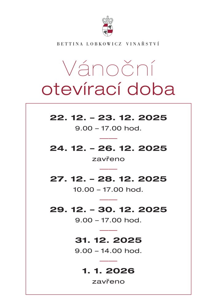 Aktuality Vánoční otevírací doba Vánoční otevírací doba 20. 12. 2025 Jak budeme mít otevřeno o vánočních svátcích v prodejně Mělník a v Depu vín Praha? Prodejna Mělník Depo vín Praha Sdílet Tweet Pin It